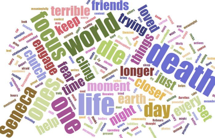 Seneca writes, “No man can have a peaceful life who thinks too much about lengthening it.” Recognizing that we are mortal is scary. Knowing that we will die, we will no longer experience the world, no longer engage in relationships, and that the earth will keep spinning whether we are here or not is terrible. It is hard to imagine a world without us and the fear of missing out on amazing new things in the world is enough to keep one up at night. But striving to stay alive forever and being afraid of death at every moment is also terrible. The constant worry that one might die is likely to elevate stress hormones and bring death a little closer. Trying in vain to do nothing but extend ones life creates an unhealthy focus on death, rather than a focus that helps us engage meaningfully with our loved ones, friends, and community.