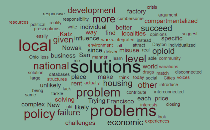 Local problem solving, as Katz and Nowak suggest, is able to look at problems in a more comprehensive way since it tailors solutions to the local environment. Solutions can be integrated instead of compartmentalized and localities can bring entrepreneurs into the fold to mix business interests and development with social responsibility and support. The policy that is likely to succeed in reducing opioid misuse San Francisco is unlikely to be the same solution that would succeed in Dayton, Ohio, but both communities could share what they learn and take advantage of local resources to build coalitions to address the problems in a manner consistent with the local experiences. National level policy cannot introduce such individualized solutions and cannot be as responsive to the local variations on a given problem.