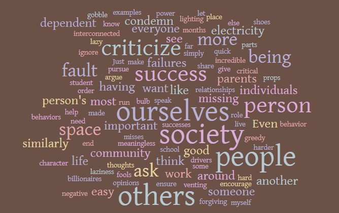 When I think about how dependent we are on others for even the most basic parts of life, such as commuting on roads we did not build to school or work, I am reminded of how important it is that we think beyond individuals when we want to criticize someone for their behavior. When we see someone who is lazy, we should ask what was missing in their life that did not properly encourage them to be the best version of themselves? When we see someone who is needlessly greedy, we should ask, how did society let this person down so that they came to see having more money or power than anyone else as being the most important thing for them to pursue? And when I see someone who directly harms others, I want to ask, where did society fail to help this person value relationships and value the interconnectedness which we all share? Just as we cannot claim 100% responsibility for our most incredible successes and must attribute something to the community when we succeed, we must do so with the failures of ourselves and the individuals we see around us. To simply criticize is to the ignore the role of society, which we are a part of. To end the negative we see around us, we must give more of ourselves to our community and work harder to ensure that what has made us a good person or a success as we define it, is there for everyone. (I know there are some people who are exceptions to the examples I gave above, but they are likely not the majority.)