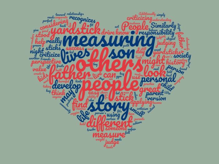 The story about the father and his son shows us how useless this practice is, and hints at how harmful it can be. The father’s criticism is pushing his son down a path toward resentment, and the father recognizes there is still time for him to reverse the trend and recognizes that he can develop a real relationship with his child. Similarly, applying your own measurement to others is unfair because you do not know what history has shaped the person you are criticizing for not measuring up to your standards. You are not considering the environmental factors that create barriers in their lives to being the perfect person you criticize them for failing to be. People at different stages of their lives with different experiences and backgrounds may hold different values than you do, and that undoubtedly leads them to have different measuring sticks for their own lives. Additionally, it is not the responsibility of anyone else to live up to the measuring stick of your personal life. It is instead your responsibility to live in community with others, and to develop relationships to help others become the best version of themselves, meeting them where they are, understanding who they are, and helping them achieve a meaningful version of success that fits who they are and what society needs. The measuring sticks we need are not the ones we develop on our own, but are those which help us cooperate in society to encourage flourishing for all.