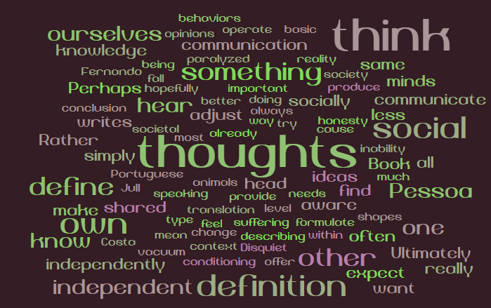 Our thoughts are generally not just our own thoughts. What we think, what we say, and ultimately what we do is influenced by other people. We are social animals and come to understand ourselves and define ourselves socially. However, we often are not aware of just how much this social conditioning shapes our thinking and understanding. Fernando Pessoa writes about this in his book The Book of Disquiet which was assembled from his notes and published after his death.