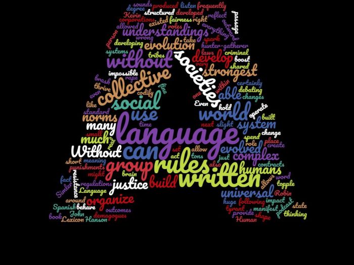 Human societies have existed with rules and norms without written language, but the written word allowed us to build corporations, to organize criminal justice systems, and to develop social contracts that hold everything in place. Our language can boost the strongest and most brash demagogues, but it can also provide the spark to organize resistance and topple that same tyrant. Language allows us to take universal understandings of right and wrong and build outward, to create a system of fairness and justice that we can all operate within. Without our language, and without the evolution of our brain to allow for language, we might be doing just fine as small hunter-gatherer tribes, but we certainly would not be able to thrive in huge social societies with collective rules.