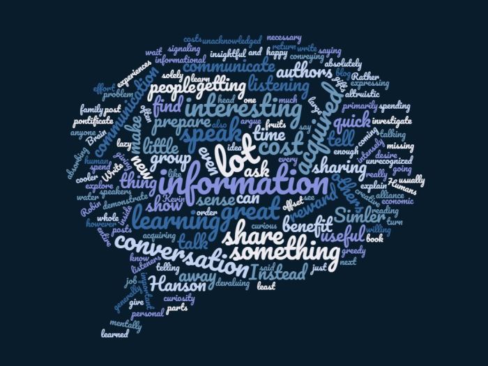 “We aren’t lazy, greedy listeners. Instead we’re both intensely curious and  happy to share the fruits of our curiosity with others.” Write Simler and Hanson, “In order to explain why we speak, then, we have to find some benefit large enough to offset the cost of acquiring information and devaluing it by sharing. If speakers are giving away little informational ‘gifts’ in every conversation, what are they getting in return?”