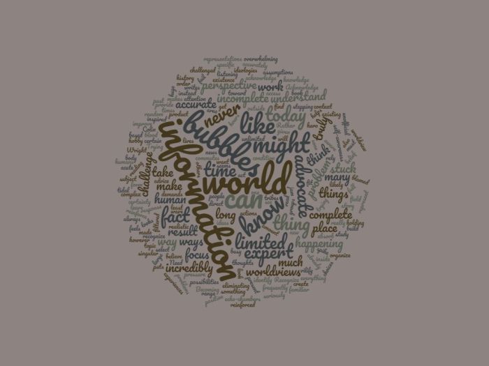 The world is busy and we only have a limited amount of time and attention to direct toward any given thing. Trying to take in information that we can understand and identify is in many ways a by product of long work hours, long commutes, too much information to know where to focus, and a world that seems to place unlimited demands on our thoughts and actions. Rather than trying to jam in more time reading things that challenge us or listening to news that might spike our blood pressure, I instead advocate for more self-awareness. Recognize how frequently we act and are inspired by a story that makes us look like the hero. Acknowledge the times when you select something to read because it looks like it will already fit in with what you want to believe. Be aware that your perspective on the world is incomplete and that the information you absorb is limited and filtered to present the world a certain way. We likely won’t be eliminating bubbles from our lives any time soon, but we can at least acknowledge their existence and recognize that we don’t have the certainty we would like about the information that helps us know what is really happening in the world.