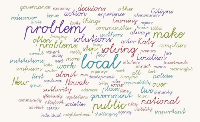Bruce Katz and Jeremy Nowak, in their 2017 book The New Localism, argue that problem solving and policy solutions to our pressing problems will not be found at the national level as we move forward, but rather at the local level. Large, established, and nationalized organizations will be less able to take on the problems of our new economy and evolving societies, but smaller, more responsive, and more local organizations and arrangements can address these challenges.