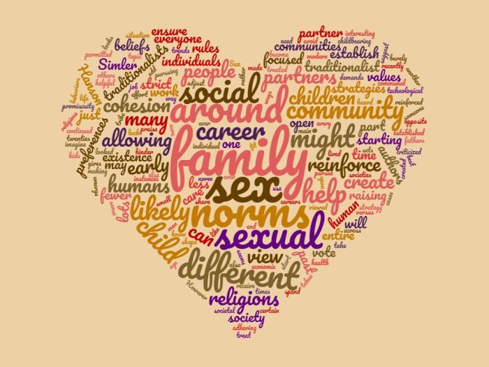 There are many ways for humans and communities to treat sex. I would imagine that different strategies at different times of human existence have been more advantageous than others. When humans barely lived past 30, when we didn’t have medical technologies for abortion, and didn’t have technology for producing contraceptives, then it made sense for certain strict rules to emerge around sex to help create communal norms that reinforced health behaviors, continued human existence, and community cohesion. On the opposite end, I recently heard someone suggest that early hunter-gatherer societies likely permitted individuals to have lots of sexual partners, and that fathers likely didn’t ever know for sure if a child was there offspring or not. This created a situation in a small tribe where it was best to just take care of every child to ensure that any child you might have was taken care of. This is another norm around sex and family that worked for the time. I may just be a modern career focused individual, but it seems to me that acknowledging that humans can have different sexual and family preferences, and allowing norms to adjust to our economic, technological, and social trends may be more helpful than adhering to strict norms established to fit different societal demands of the past.