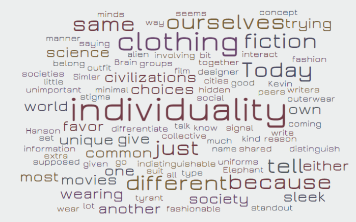 We choose clothes that say something about us. They signal the groups we belong to, how much we adhere to social norms, and what kind of person we think of ourselves as. We are not just trying to look good, we are trying to give people extra information about ourselves so that they know a little bit about who we are without having to interact with us directly. In movies they tell us who are background characters we can forget about, and in science fiction they tell us that society has congealed together in an efficient and unified manner. Today, however, they tell the world how special and unique we want to be.