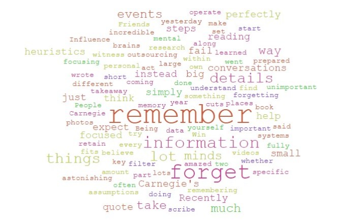 The takeaway from Carnegie’s quote is simply that our minds are not perfect. Don’t expect yourself to remember every single detail, and instead set up systems to remember the big things. Being aware of how much we will forget will help us take steps to remember what we need to remember, whether that is using notes, mental heuristics for remembering key information, or outsourcing our memory to photos, videos, or our own personal scribe. Be prepared to forget a lot of information, and take steps to retain that which matters most.